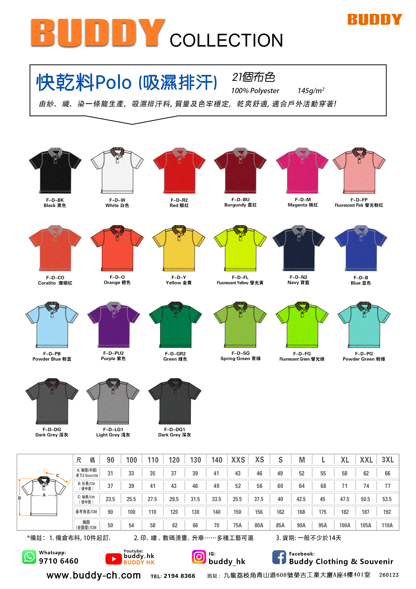 BUDDY經典快乾料Polo Shirt (吸濕排汗) (145 g/m²) 由紗、織、染一條龍生產,吸濕排汗料,質量及色牢穩定,乾爽舒適,適合戶外活動穿著! 21個布色 100% Polyester 報價及其他查詢