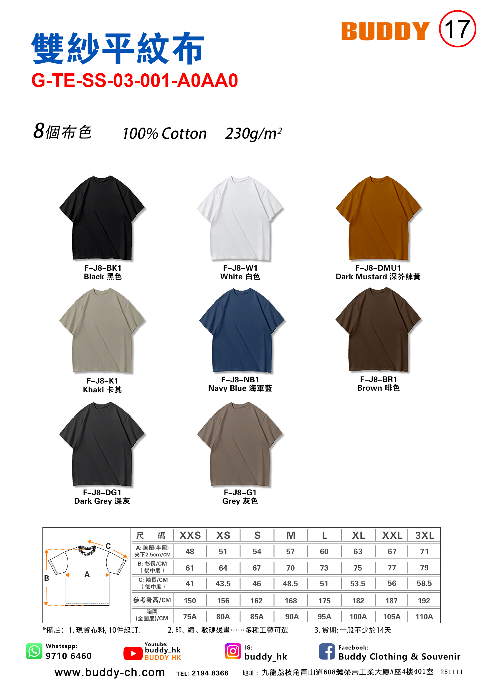 No. 17 BUDDY Oversize 板仔Tee 雙紗平紋布 (230 g/m²) G-TE-SS-03-001-A0AA0 適合追求個性團體的重磅TEE 零縮水 厚身全棉板TEE,寬鬆版型 8個布色 100% Cotton 230 g/m² 報價及其他查詢