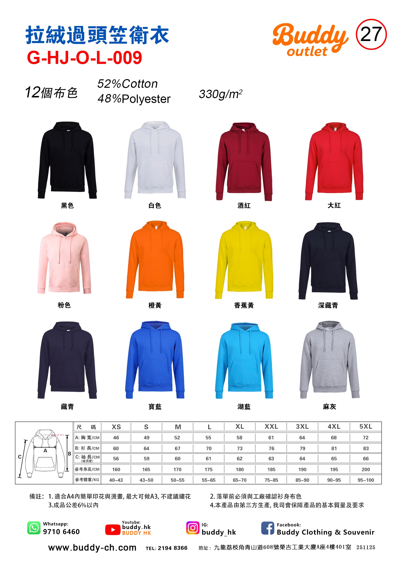 No. 27 拉絨過頭笠衛衣 (330 g/m²) G-HJ-O-L-009 BUDDY OUTLET 成品衛衣 12個布色 52%Cotton 48%Polyester 330 g/m² 報價及其他查詢